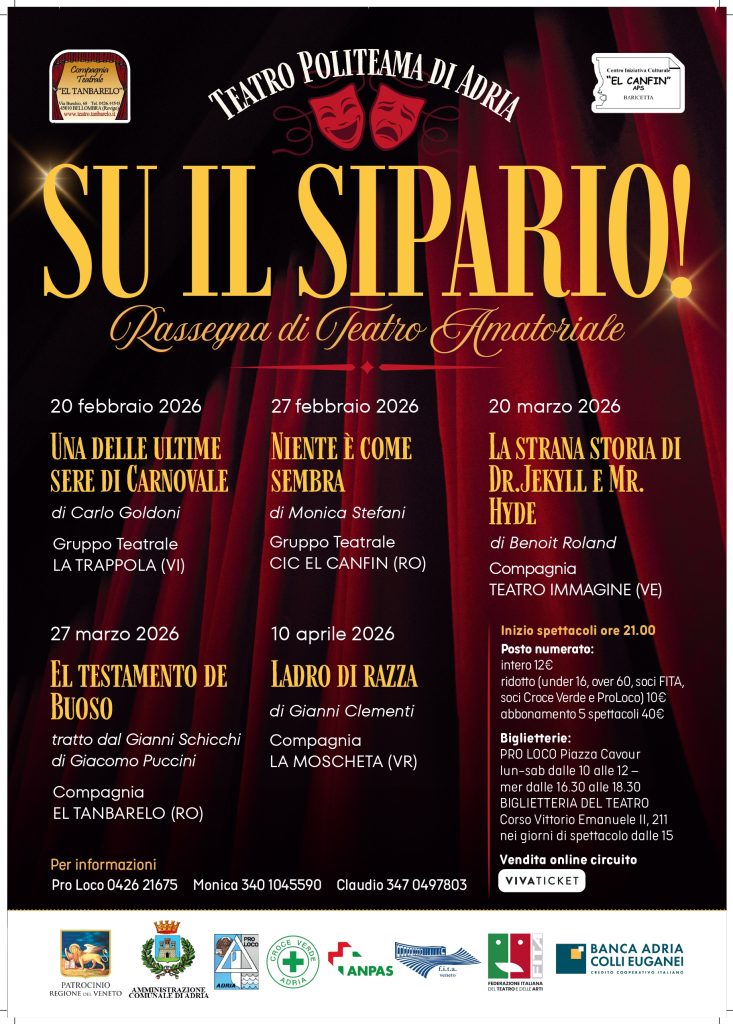 Il CIC El Canfin di Baricetta e El Tanbarelo di Bellombra presentano “SU IL SIPARIO!”, una rassegna di teatro amatoriale che riporta il pubblico al centro della scena e restituisce al Teatro Politeama il suo ruolo di luogo di incontro, emozione e comunità.